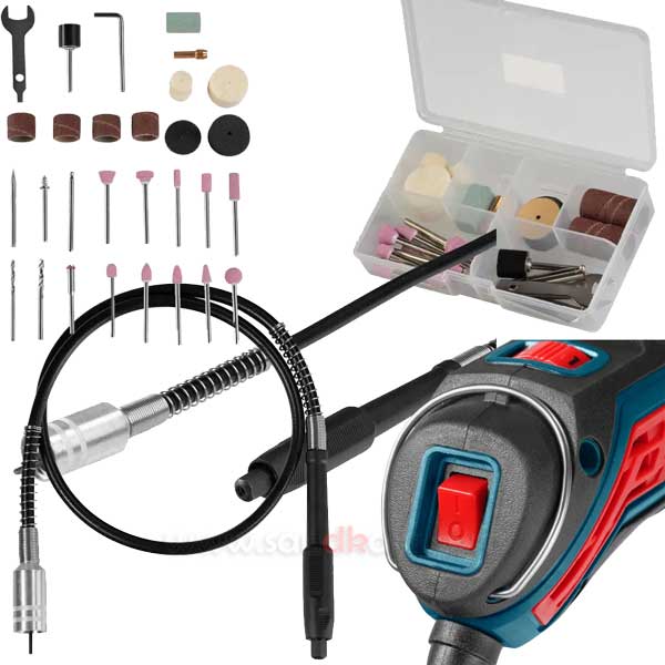 پلمپ کارخانه ,ده عدد چرخ سنگ زنی با شفت 3.2 میلی متری، یک عدد شفت سنباده 3.2 میلی متری، دو عدد سنبه 3.2 میلی متری، دو عدد مته 2.3 میلی متری و 3.2 میلی متری، دو عدد مته الماس 3.2 میلی متری، یک عدد آچار، دو عدد کولت 2.3 میلی متری و 3.2 میلی متری، هشت عدد سنگ برش، سه عدد نوار سمباده، چهار عدد نمد، یک عدد سنگ آهن، چهار عدد نوار سمباده، یک عدد محور (شلنگ) منعطف + کیف مخصوص |